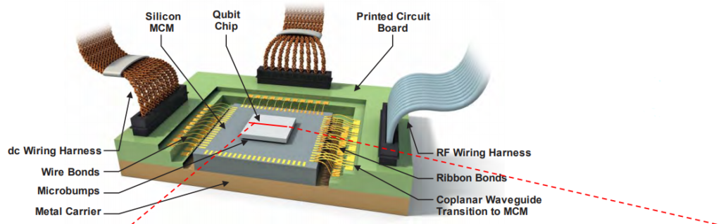Fig. 1 shows a module that can clarify Quantum Access. The module in fig. 1 includes both qubits and control electronics, intended to be used in a cryogenic environment. While creating the module the first time was an original research project beyond the proposed capability of Quantum Access, duplicating the module is less risky. As described above, the real goal is not exact duplication, but, for example, retrofitting an innovative qubit design into an otherwise proven test platform.